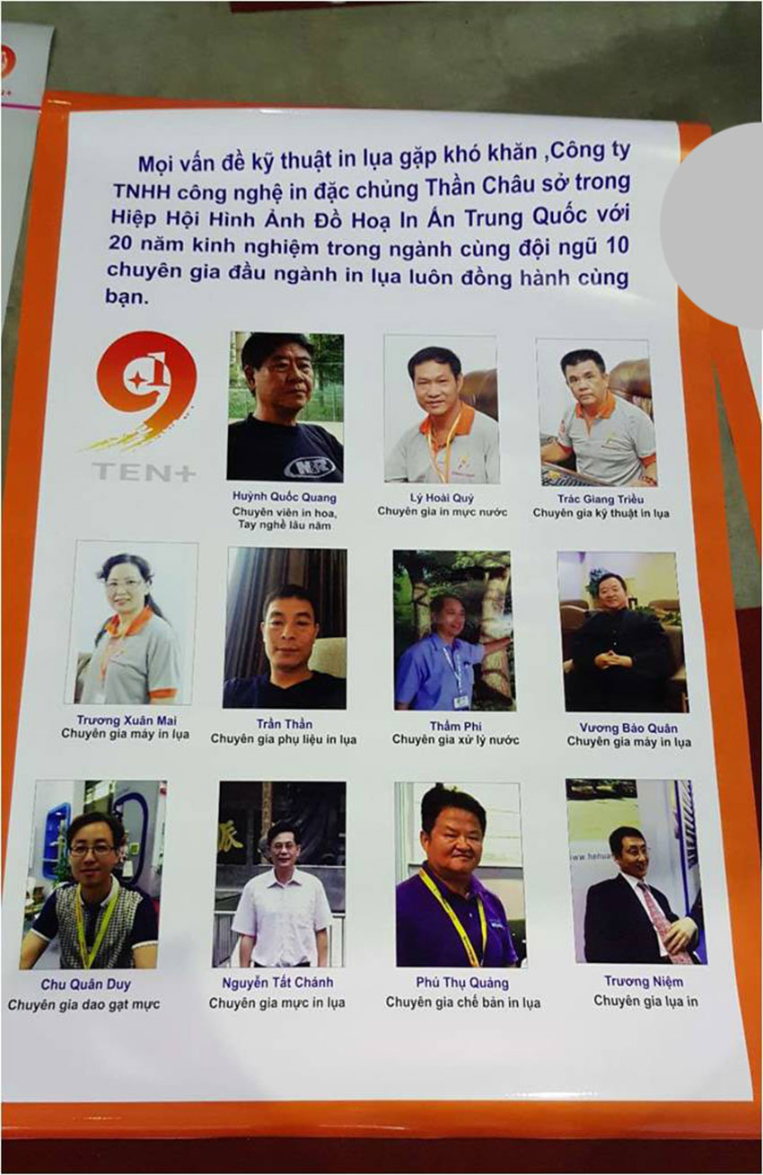 1.越南9+1是由中國境內經驗豐富的印花專業配套生產商組建的完整產業鏈團隊,從網框網紗到機械設備印刷工藝提供全方位服務,企業主個人從業經歷15年—40年不等,現有胡志明工作人員7名,河內工作人員6名,隨時為新老客戶提供技術建議技術支持等服務。