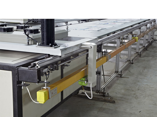 6、兩條臺板可循環印花,由第一條臺板自動轉換到第二條,收鋪料不需要等待,節約時間從而提高印花效率。單臺板往返運作或雙臺板循環操作均可以在電腦控制屏上自由設置,并可根據客戶廠地而設計運行長度。